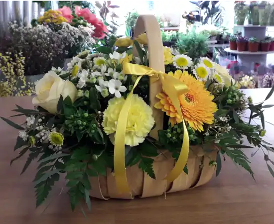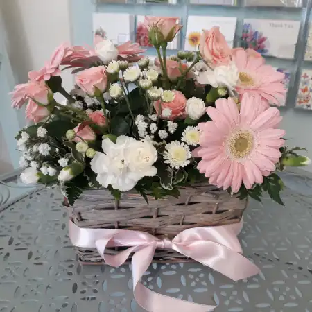 Beautiful white floral gift basket with large white Roses, white Alstroemeria, spray Carnations and complimentary foliage. An ideal gift for any occasion. Birthdays, Sympathy, Birthday, Gift, Thank you and the list goes on alternatively choose your own colour combination.